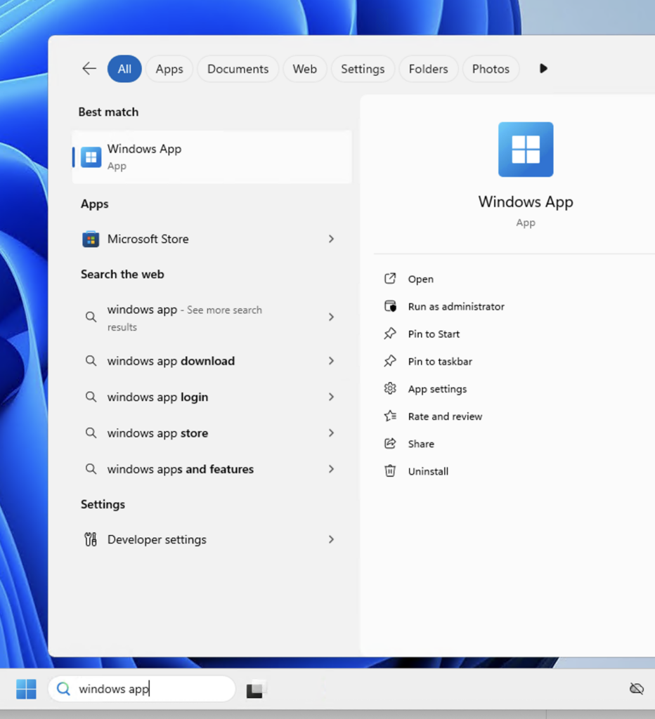 In the Search bar at the bottom of the screen, start typing “Windows App”. It should display results like this: